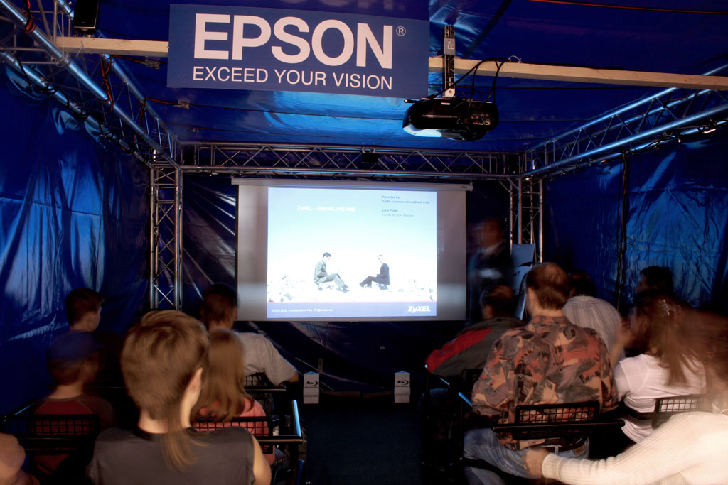 - Druhá, s názvem "multifunkční kinosál" nabízela divákům zážitek technoloogie filmů na BluRay, přehrávaných na FullHD projektoru Epson a ozvučeném 5.1 domácím kinem Logitech.